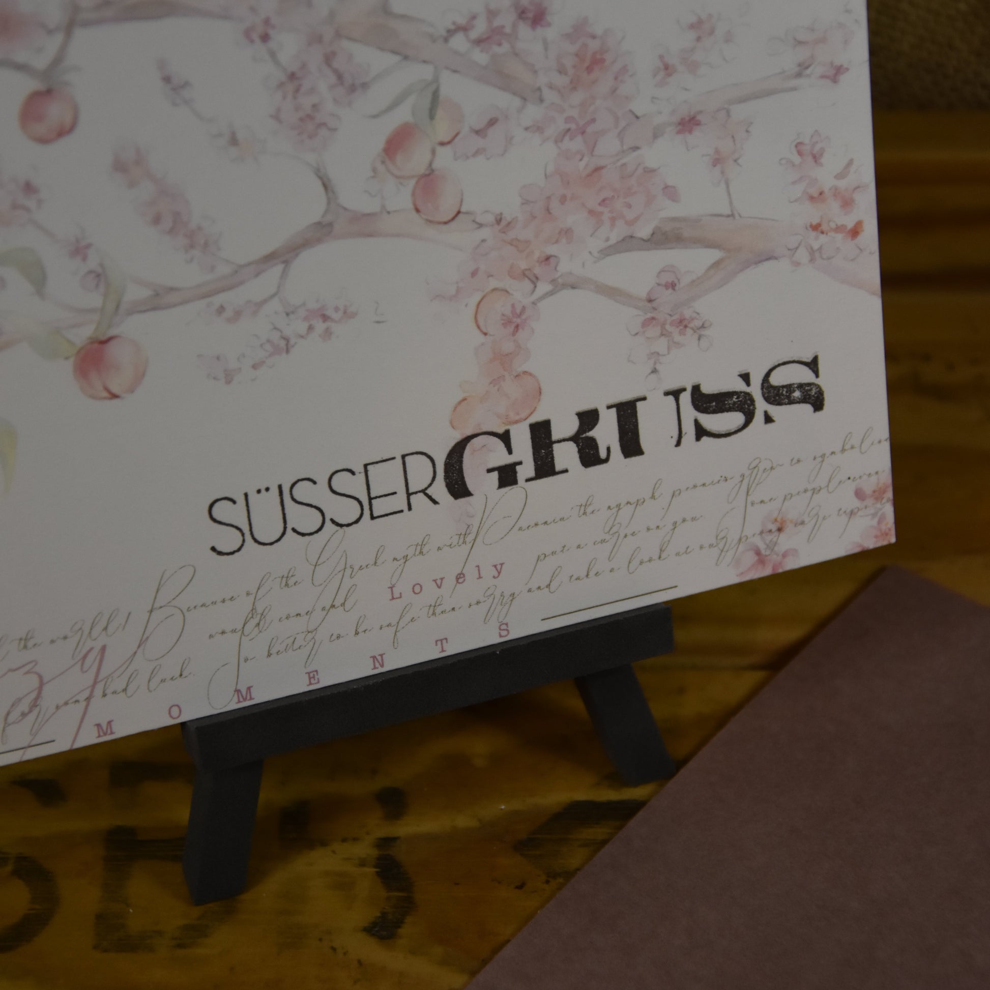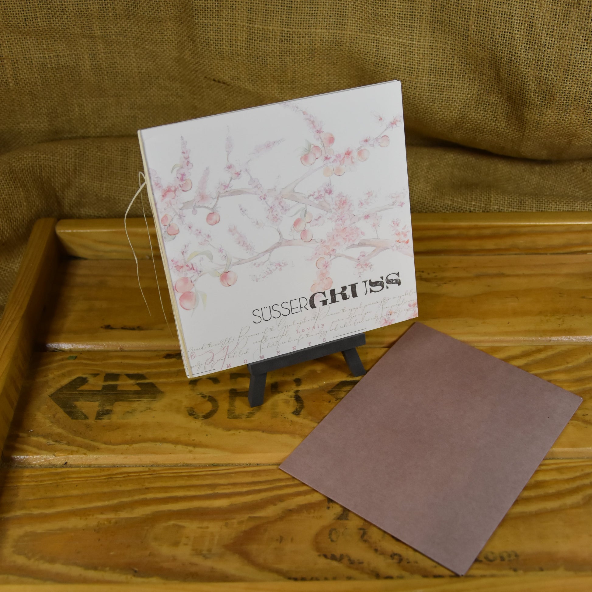 Diese handgefertigte Doppelkarte bezaubert mit einem filigranen Blütenzweig-Motiv in zarten Rosatönen. Sie steht symbolisch für Neubeginn, Schönheit und Vergänglichkeit – und trägt die Botschaft eines „süssen Grusses“ in die Welt hinaus. Ideal für liebevolle Worte, kleine Aufmerksamkeiten oder als feine Begleitung zu einem Geschenk.