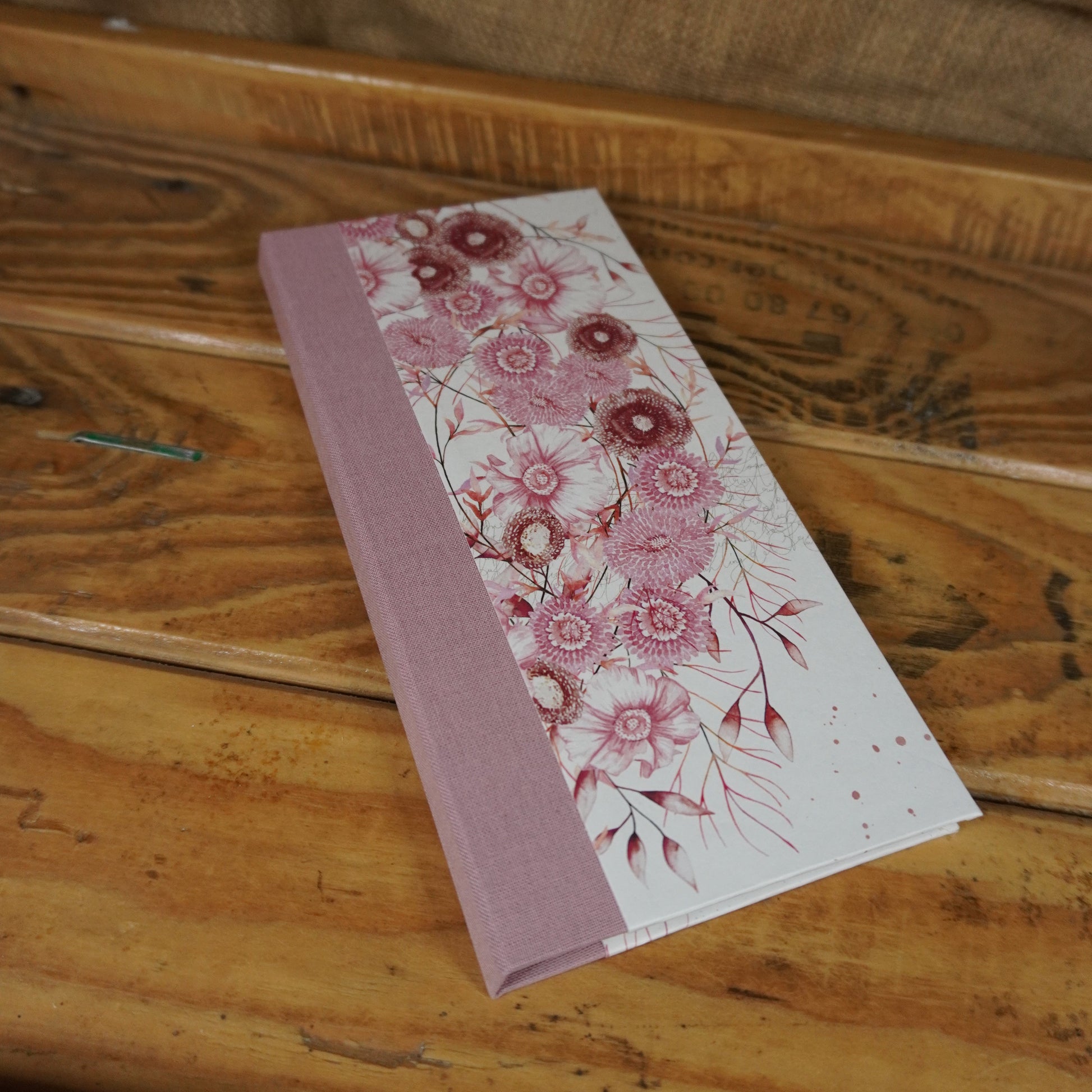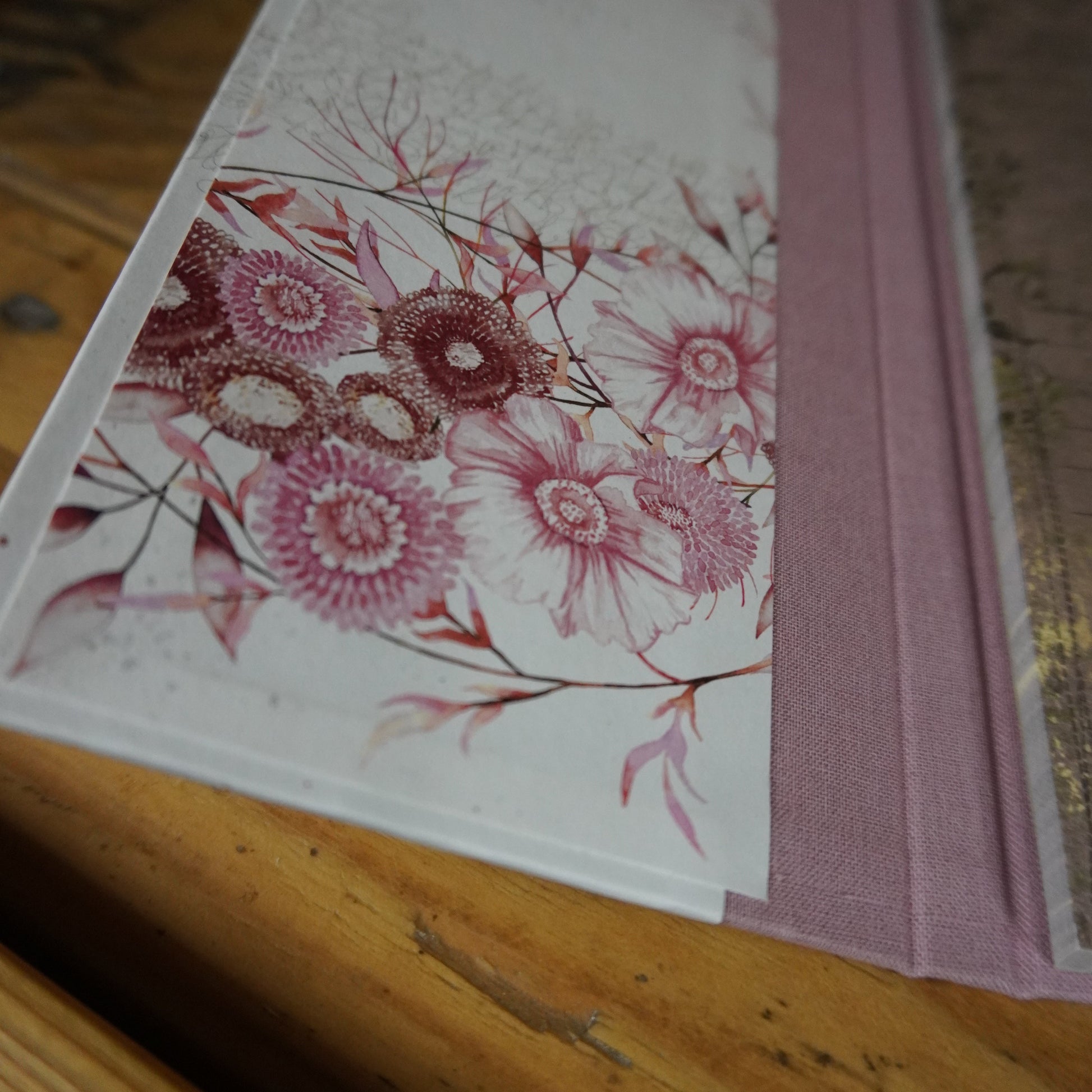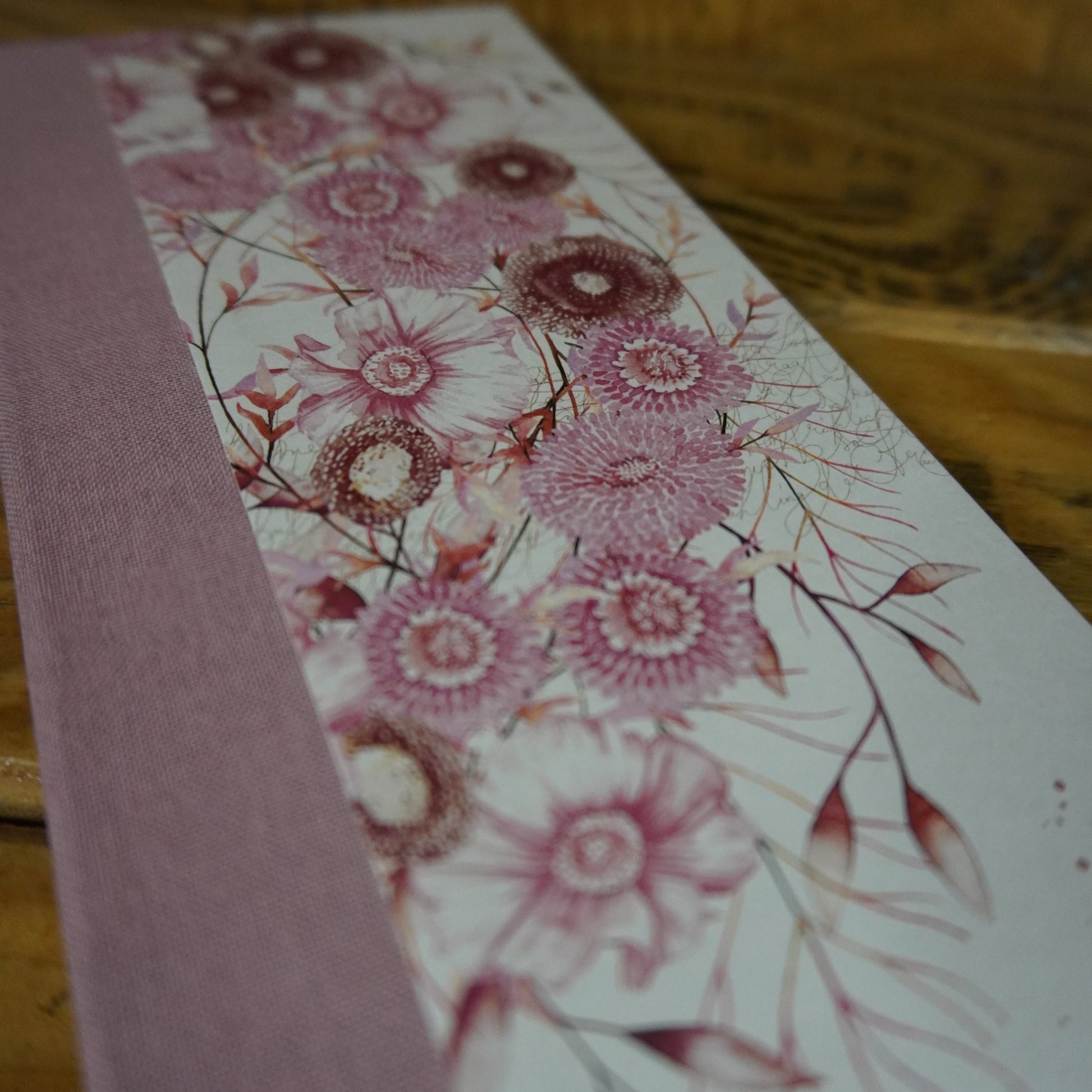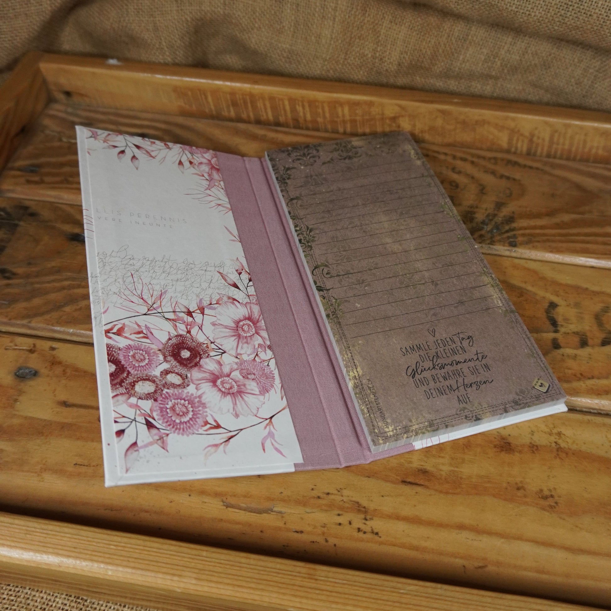 Dieses handgefertigte Haftnotizblöckchen (10 x 21,5 cm) bringt den Zauber zarter Gänseblümchen auf deinen Schreibtisch. Das florale Design in Rosatönen, kombiniert mit einem Rücken aus feinem Buchleinen, verleiht dem Blöckchen eine elegante und zugleich natürliche Note – perfekt für Einkaufslisten, Gedanken oder kleine Notizen im Alltag.