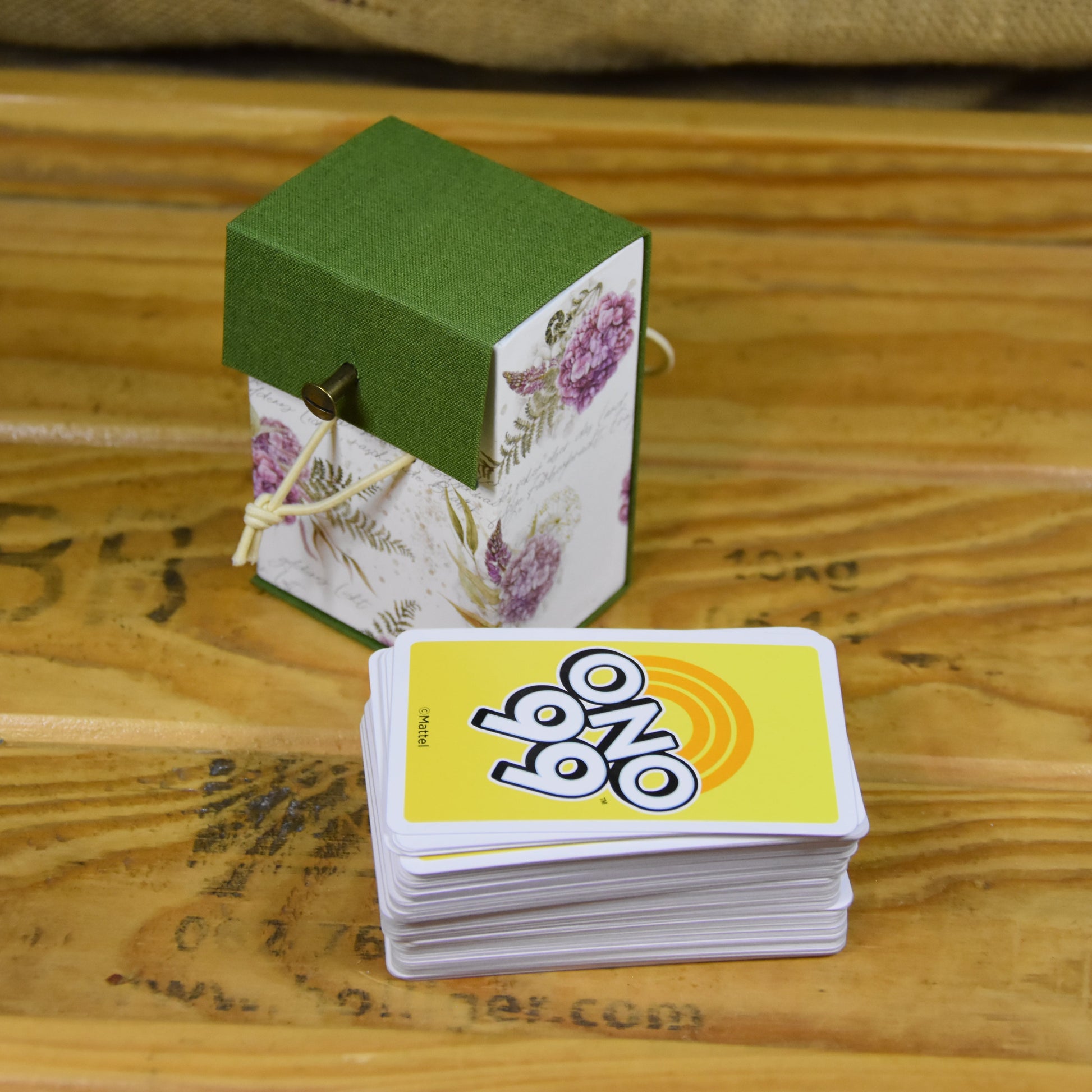 Diese handgefertigte Kartenspielbox bietet ausreichend Platz für ein Kartenspiel wie Uno, inklusive der Anleitung. Der Umschlag besteht aus hochwertigem Buchbinderleinen und Designpapier, was die Box langlebig und gleichzeitig dekorativ macht.